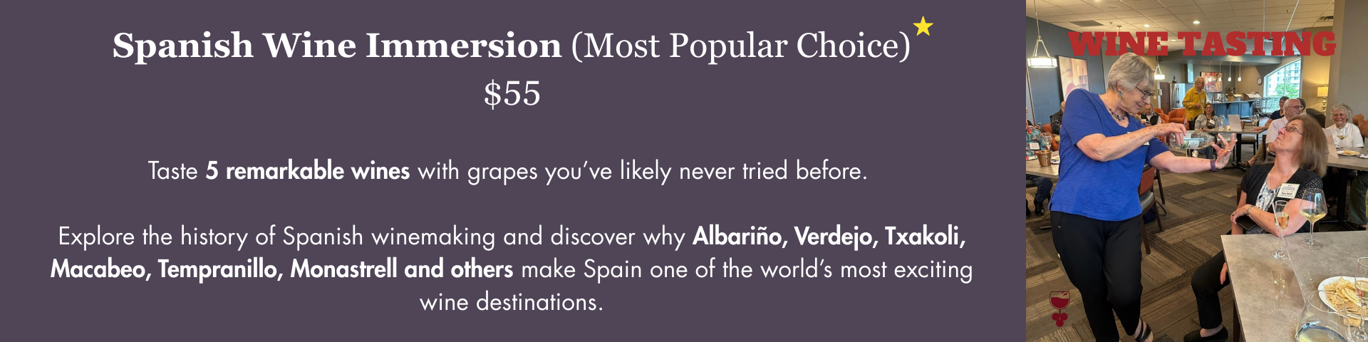 - Curated Spanish wine tasting experience (BYOB)